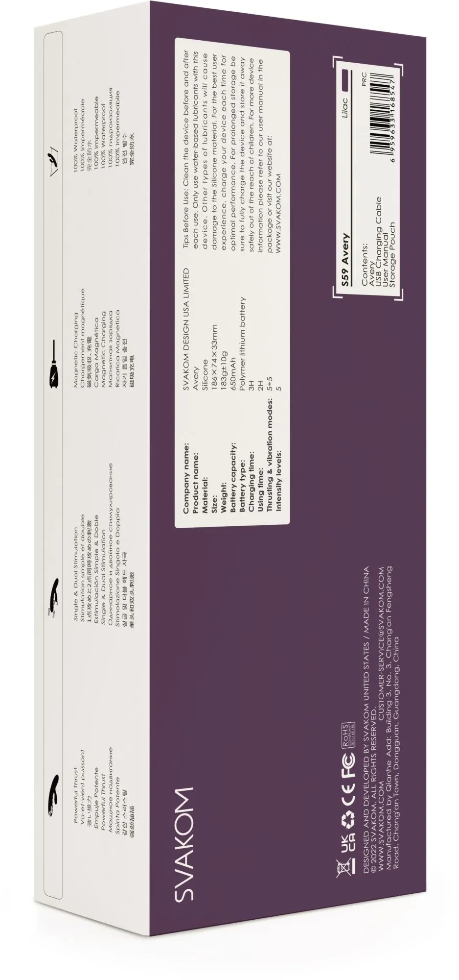 Avery позволяет забыть о подзарядке, ведь ее точно хватит для одной сессии и даже больше! Укомплектованный магнитной зарядкой, Avery быстро заряжается, чтобы вы могли насладиться девайсом, когда захотите.