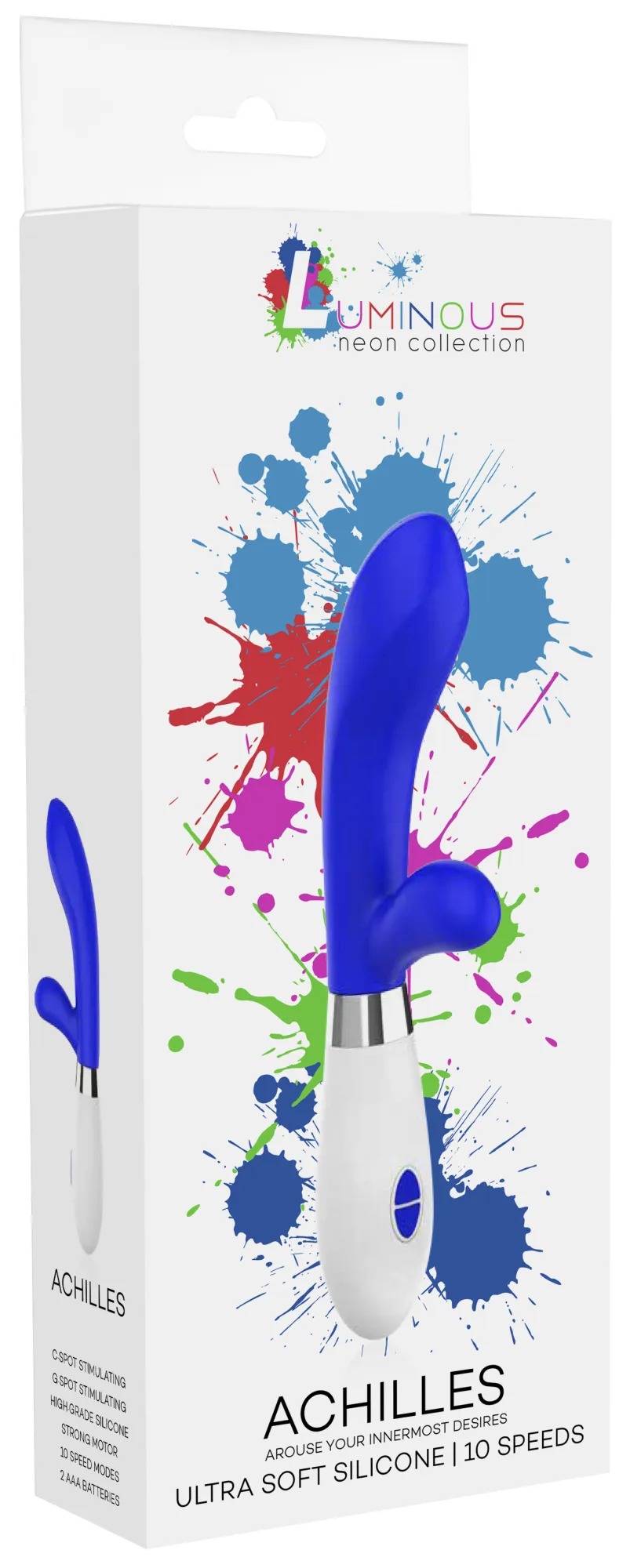 Вибратор-кролик – Achilles имеет округлую утолщённую головку и гибкий клиторальный отросток, что делает стимуляцию более яркой. Вибромассажер имеет два мощных двигателя, по одному в каждом отростке, имеющих 10 функций вибрации, способной достигать на вагинальном стволе до 7000 и на клиторальном отростке до 5200 оборотов в минуту, при этом уровень звука не превышает 60 дБ.