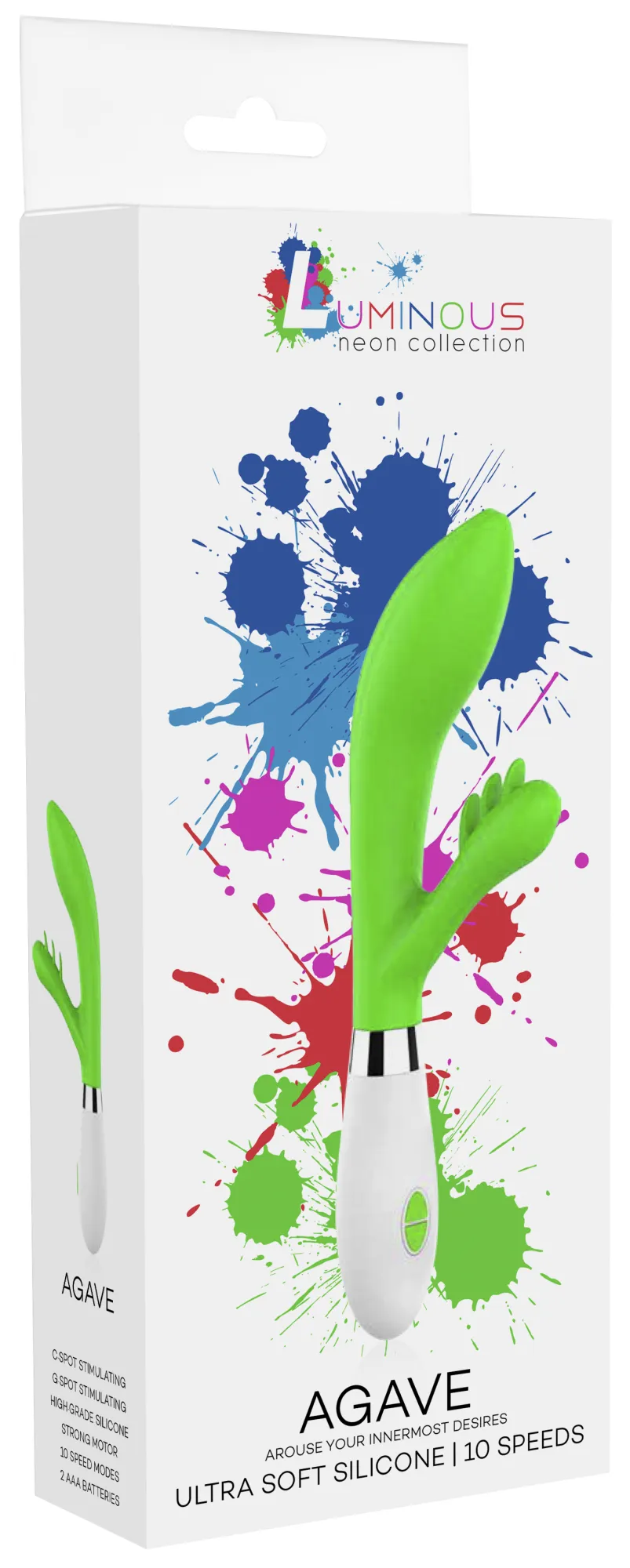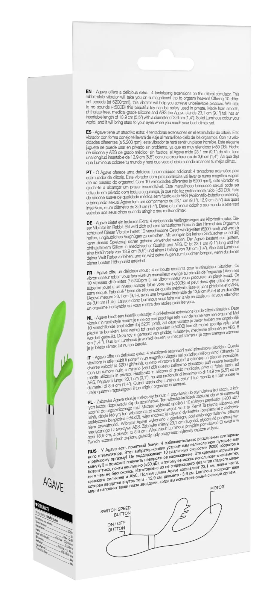 Вибратор - кролик Agave имеет округлую утолщённую головку и гибкий клиторальный отросток, что делает стимуляцию более яркой. Вибромассажер имеет два мощных двигателя, по одному в каждом отростке, имеющих 10 функций вибрации, способной достигать на вагинальном стволе 15000 и на клиторальном отростке 5200 оборотов в минуту, при этом уровень звука не превышает 50 дБ.