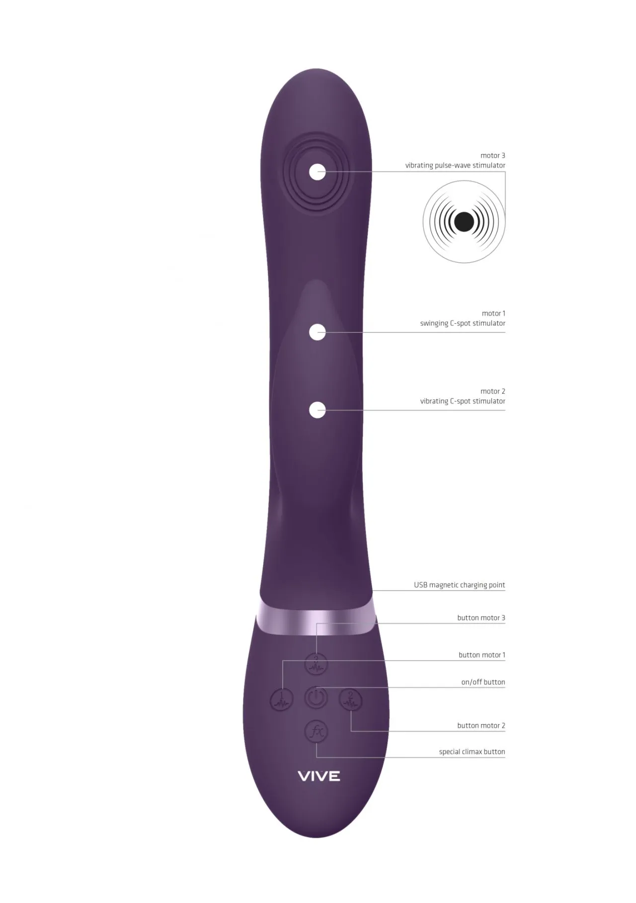 Изготовлено изделие из шелковистого медицинского (гипоаллергенного) силикона и как большинство моделей линейки VIVE имеет кнопку мгновенного оргазма, запуская все моторы на максимум одним касанием.