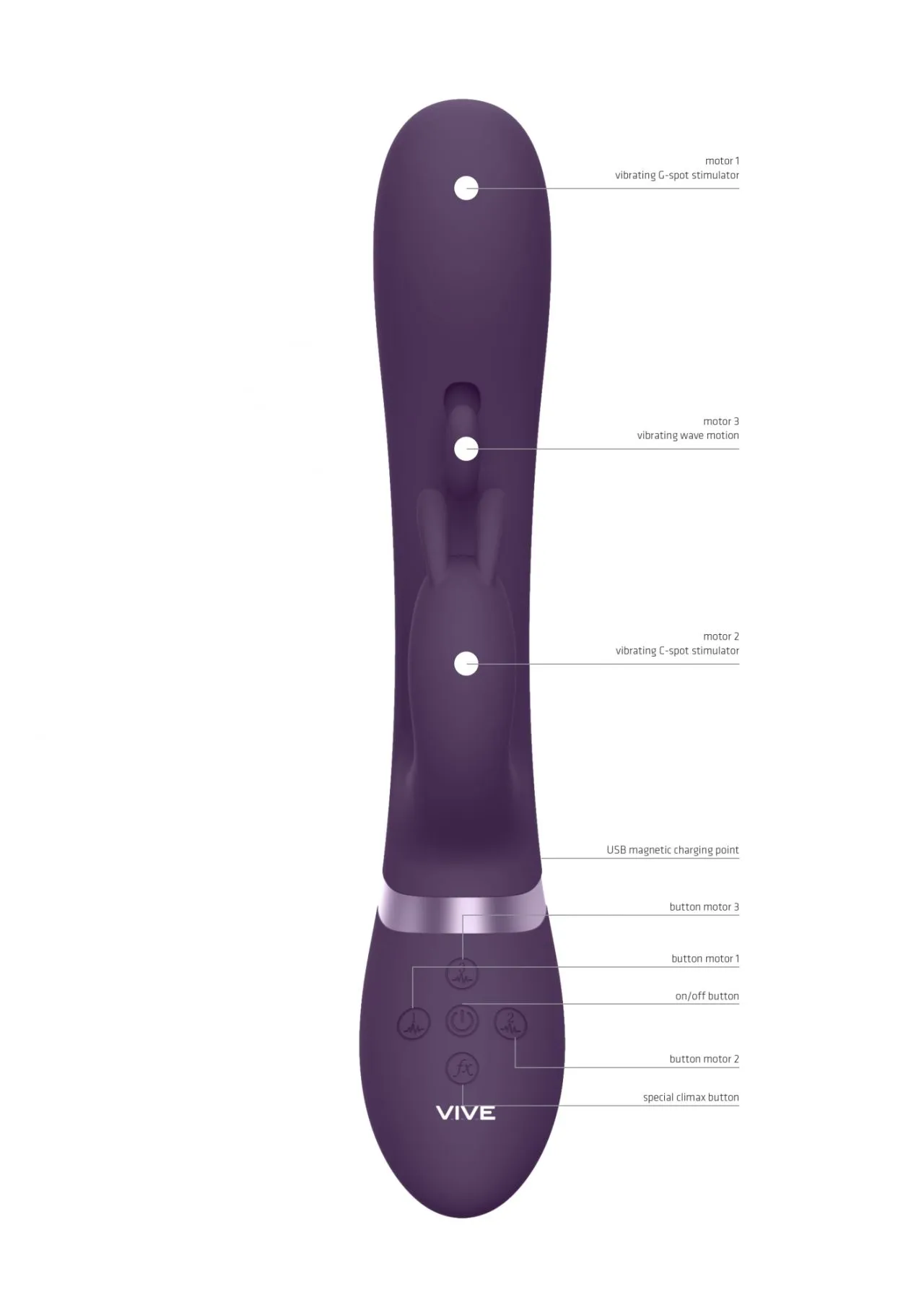 Изготовлено изделие из шелковистого медицинского (гипоаллергенного) силикона и как большинство моделей линейки VIVE имеет кнопку мгновенного оргазма, запуская все моторы на максимум одним касанием.