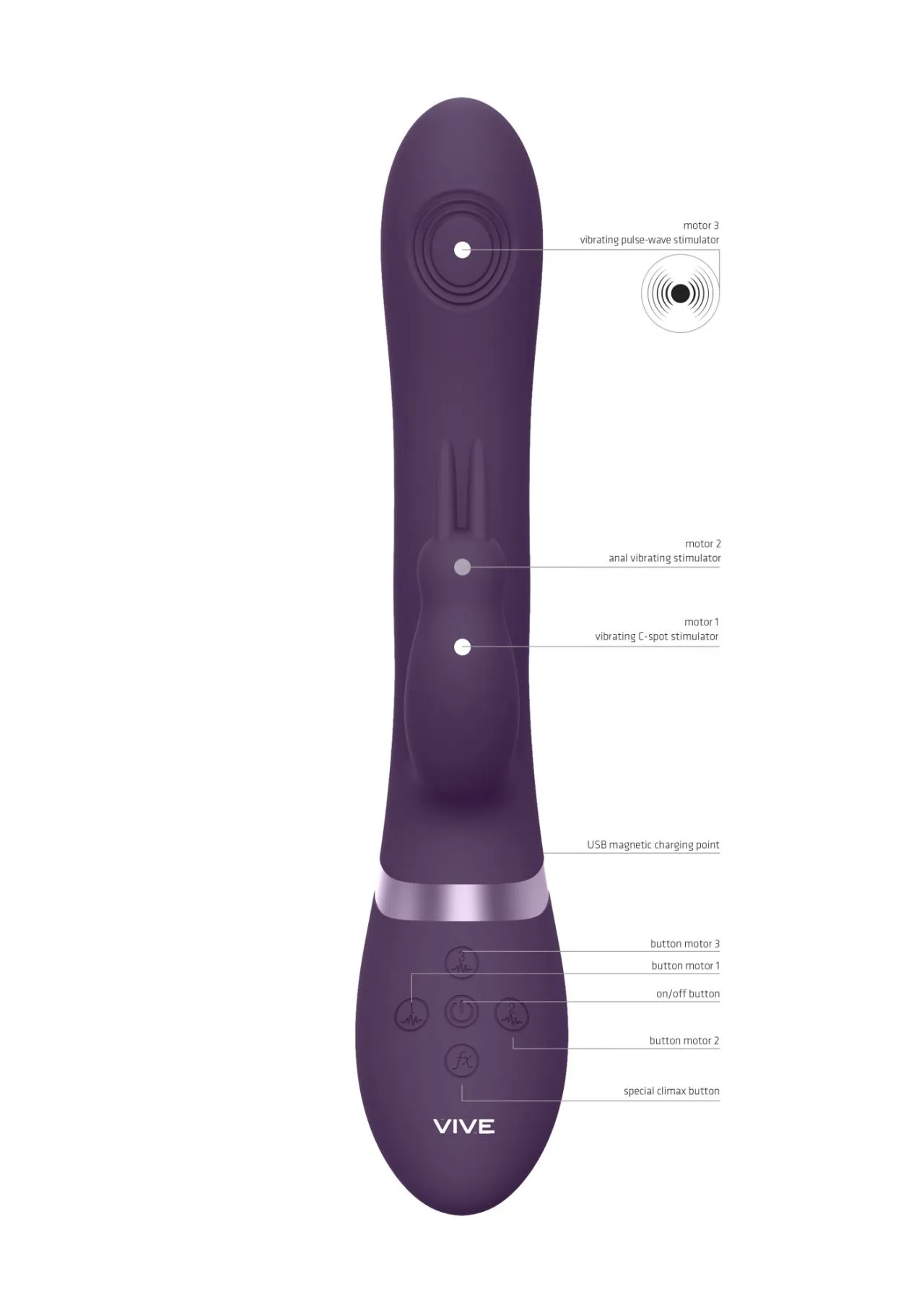 Изготовлено изделие из шелковистого медицинского (гипоаллергенного) силикона и как большинство моделей линейки VIVE имеет кнопку мгновенного оргазма, запуская все моторы на максимум одним касанием.