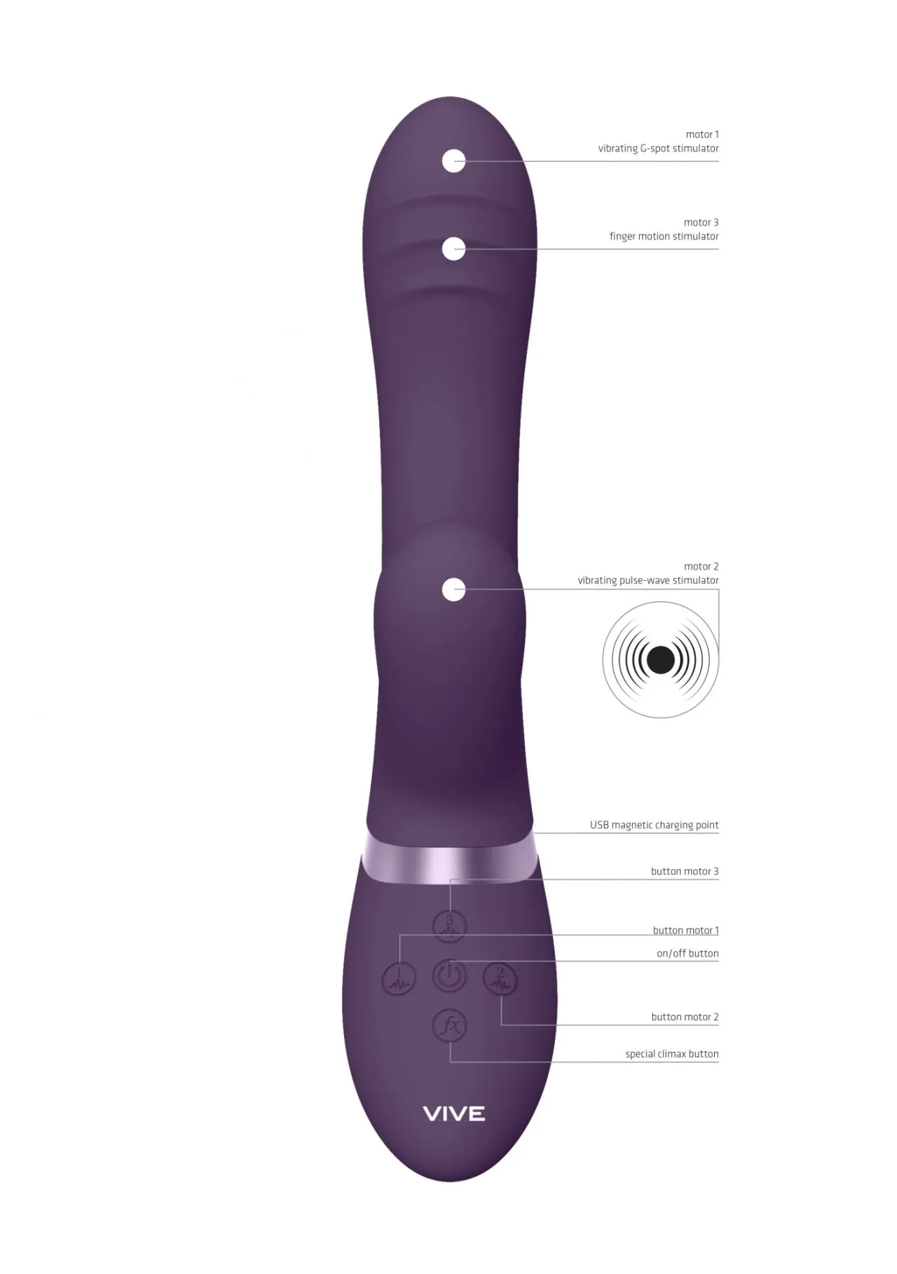 Оснащен 3 мощными независимыми моторами: вибрационный в головке, импульсно-волновой в клиторальном отростке и Finger Motion мотор.