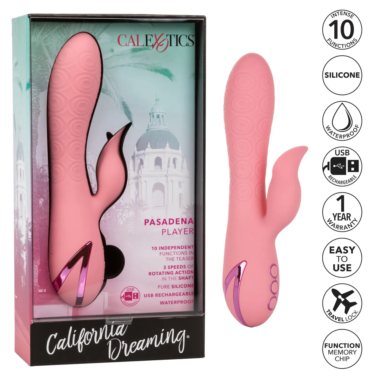 Вибромассажер Pasadena Player – перезаряжаемый мульти скоростной вибратор кролик из бесшовного материала премиум-класса с дополнительной обработкой. Вагинальный отросток у этой модели имеет 3 скорости вращения вала «ротации». Клиторальный отросток имеет языкоподобную форму и отдельный мощный виброэлемент, обеспечивающий 10 режимов интенсивной вибрации.