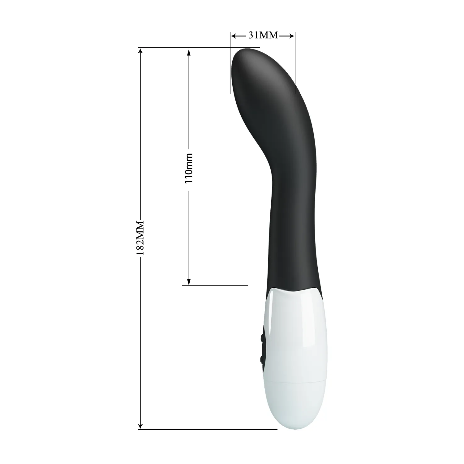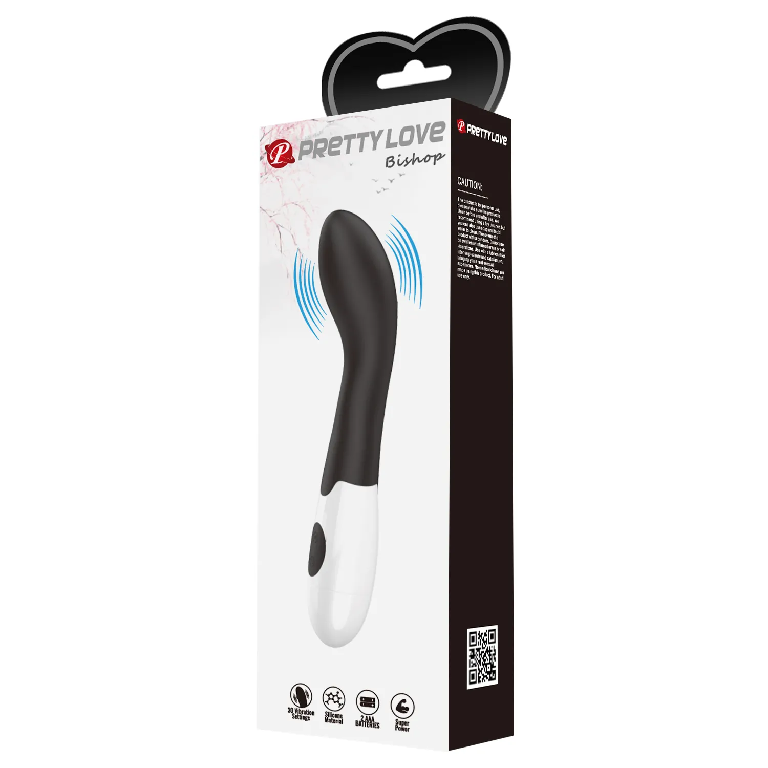 Вибратор Bishop от бренда PRETTY LOVE изготовлен из силикона и ABS. Оснащён 30 функциями вибрации и работает на 2 батарейках типа AAA. Имеет изогнутую форму с округлой, слегка выпуклой головкой для интенсивной стимуляции точки G. Общий диаметр — 3,1 см, общая длина — 18,2 см, длина рабочей части — 11 см. Вес — 92 грамма.
