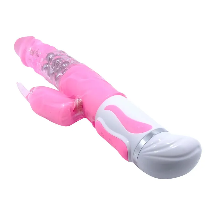 Розовый вибромассажер с режимом вращения ствола и мощным клиторальным стимулятором в виде зайчика. Имеет 12 режимов вибрации и 4 скорости ротации. Внутри ствола расположены жемчужный шарики. Мягкий, имеет не пористую структуру. Материал изготовления-ПВХ. Работает от четырех батареек типа ААА. Длина 27 см, максимальный диаметр 3,5 см, длина стимулятора 6 см, диаметр 3 см. Упаковка: картонная коробка с принтом.