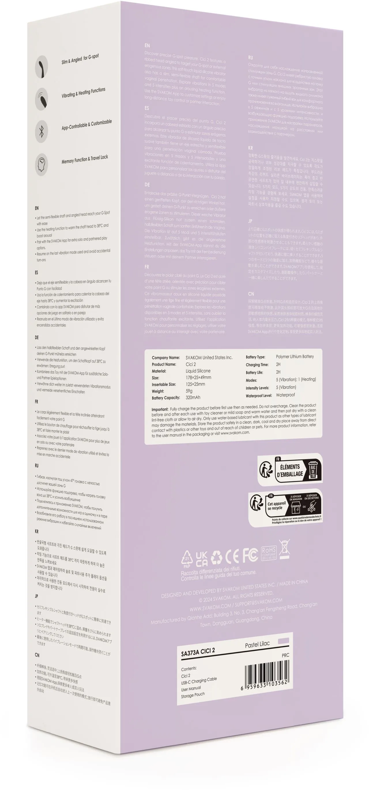 Встречайте Cici 2. Тонкий вибратор для зоны G, управляемый через приложение, от SVAKOM — это обновленная модель бестселлера Cici. Заставьте свою зону G сиять с помощью ультратонкого и сверхпрочного Cici 2.