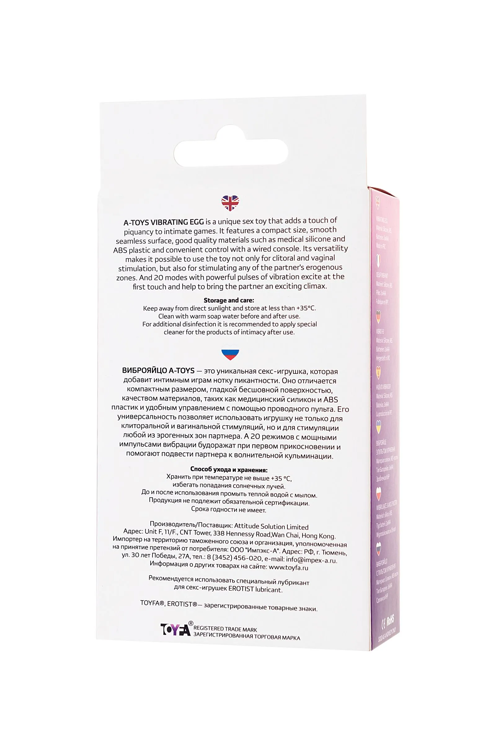 Виброяйцо A-Toys Costa — это уникальная секс-игрушка, которая добавит интимным играм нотку пикантности. Оно отличается компактным размером, гладкой бесшовной поверхностью, качеством материалов, таких как медицинский силикон и ABS пластик и удобным управлением с помощью проводного пульта. Его универсальность позволяет использовать игрушку не только для клиторальной и вагинальной стимуляций, но и для стимуляции любой из эрогенных зон партнера. А 20 режимов с мощными импульсами вибрации будоражат при первом прикосновении и помогают подвести партнера к волнительной кульминации.