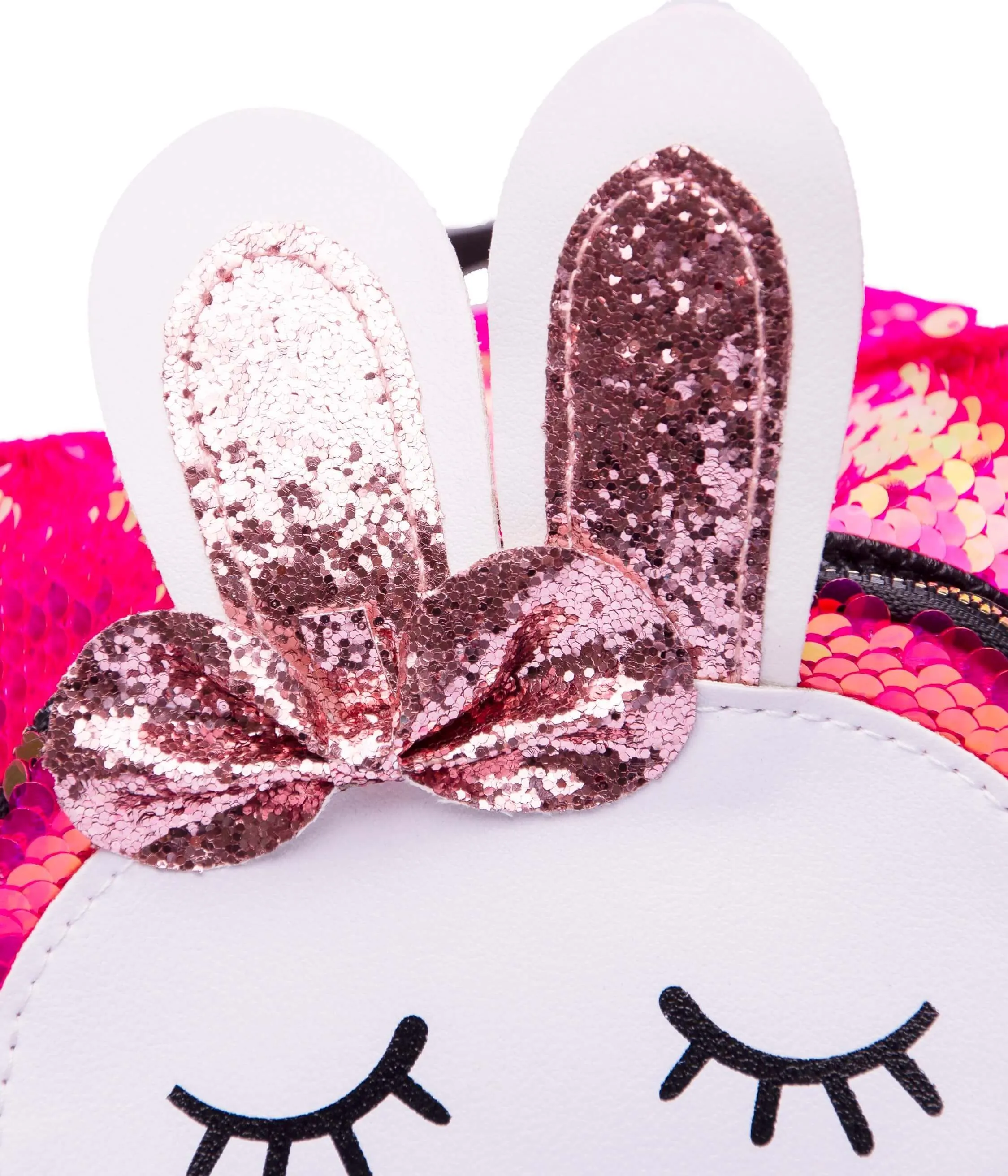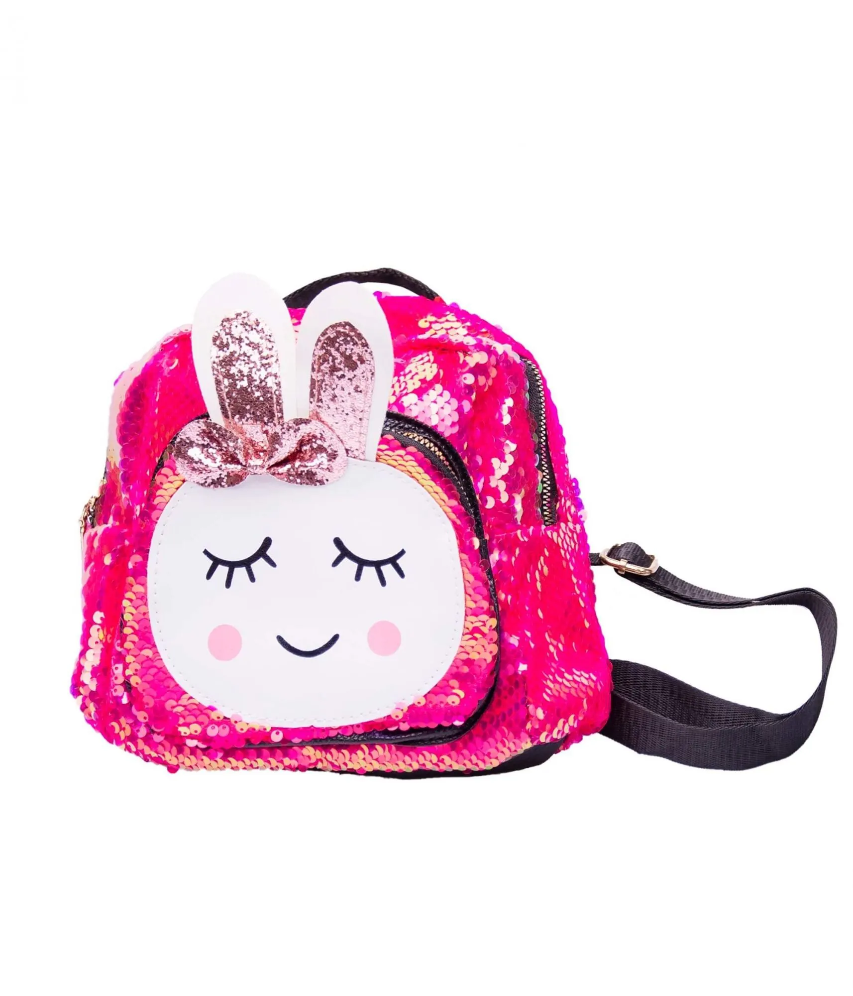 - с лицевой стороны рюкзак украшен мордочкой и блестящими ушками зайца со сверкающим бантиком
