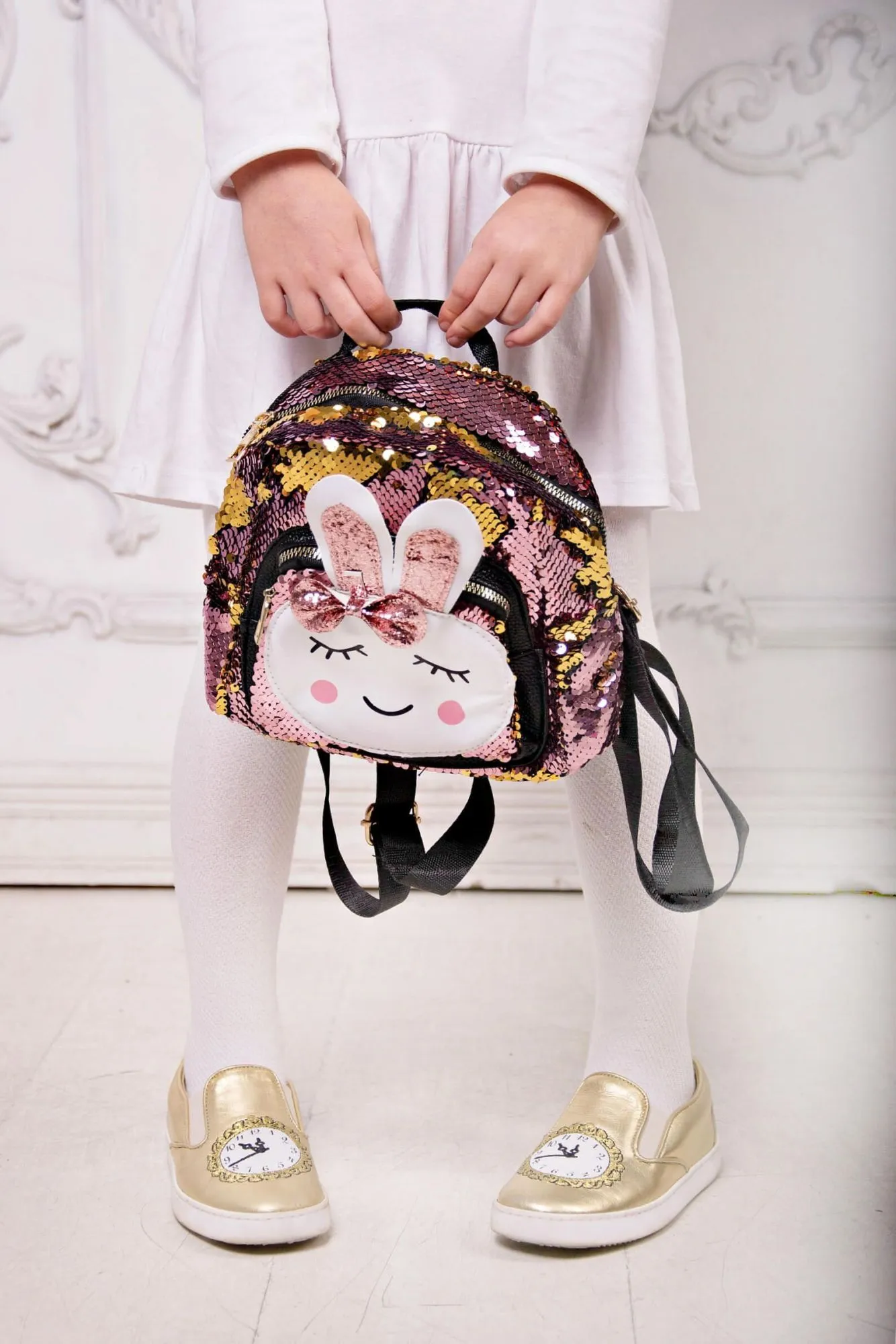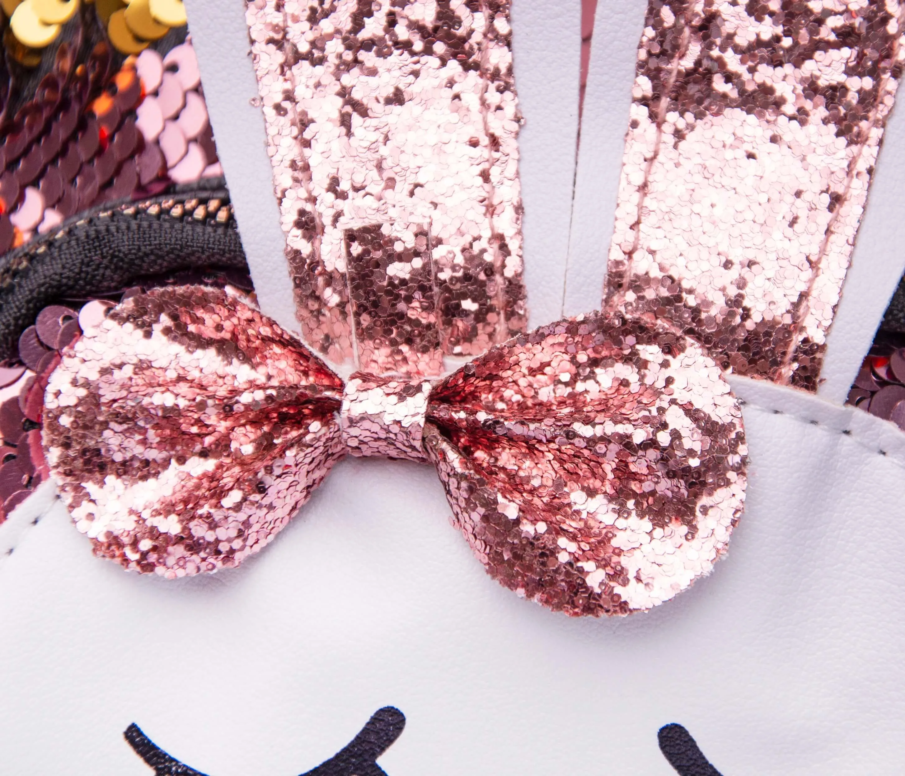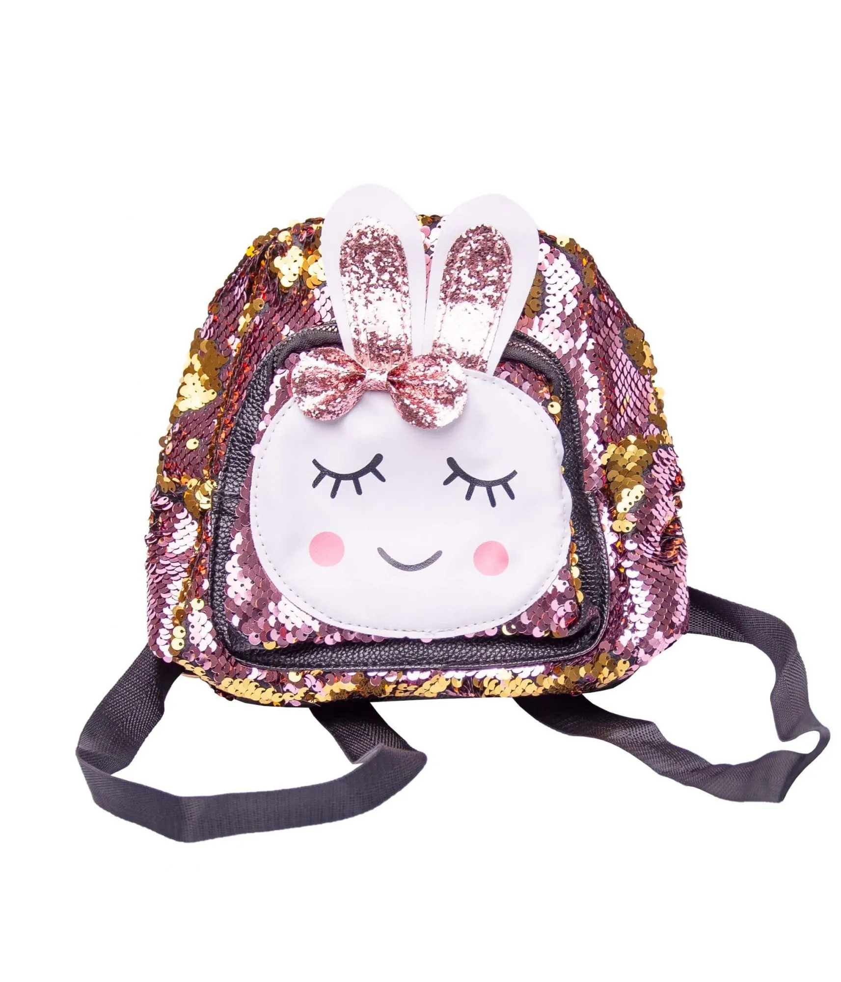 - с лицевой стороны рюкзак украшен мордочкой и блестящими ушками зайца со сверкающим бантиком