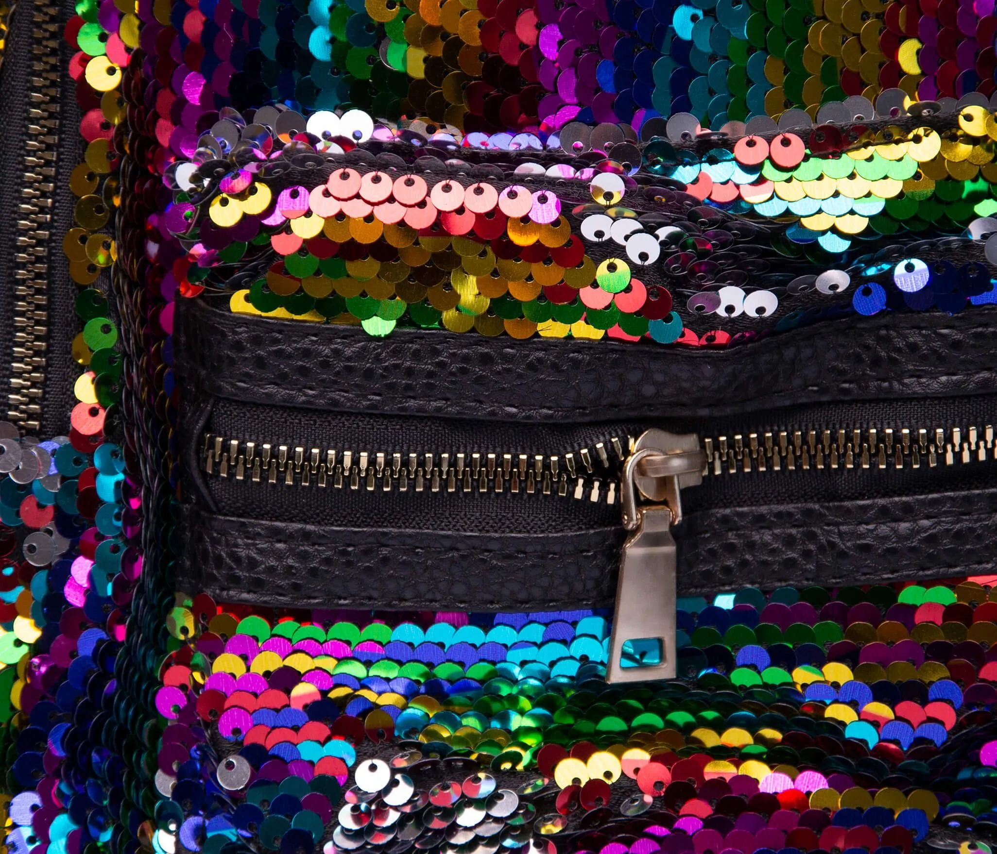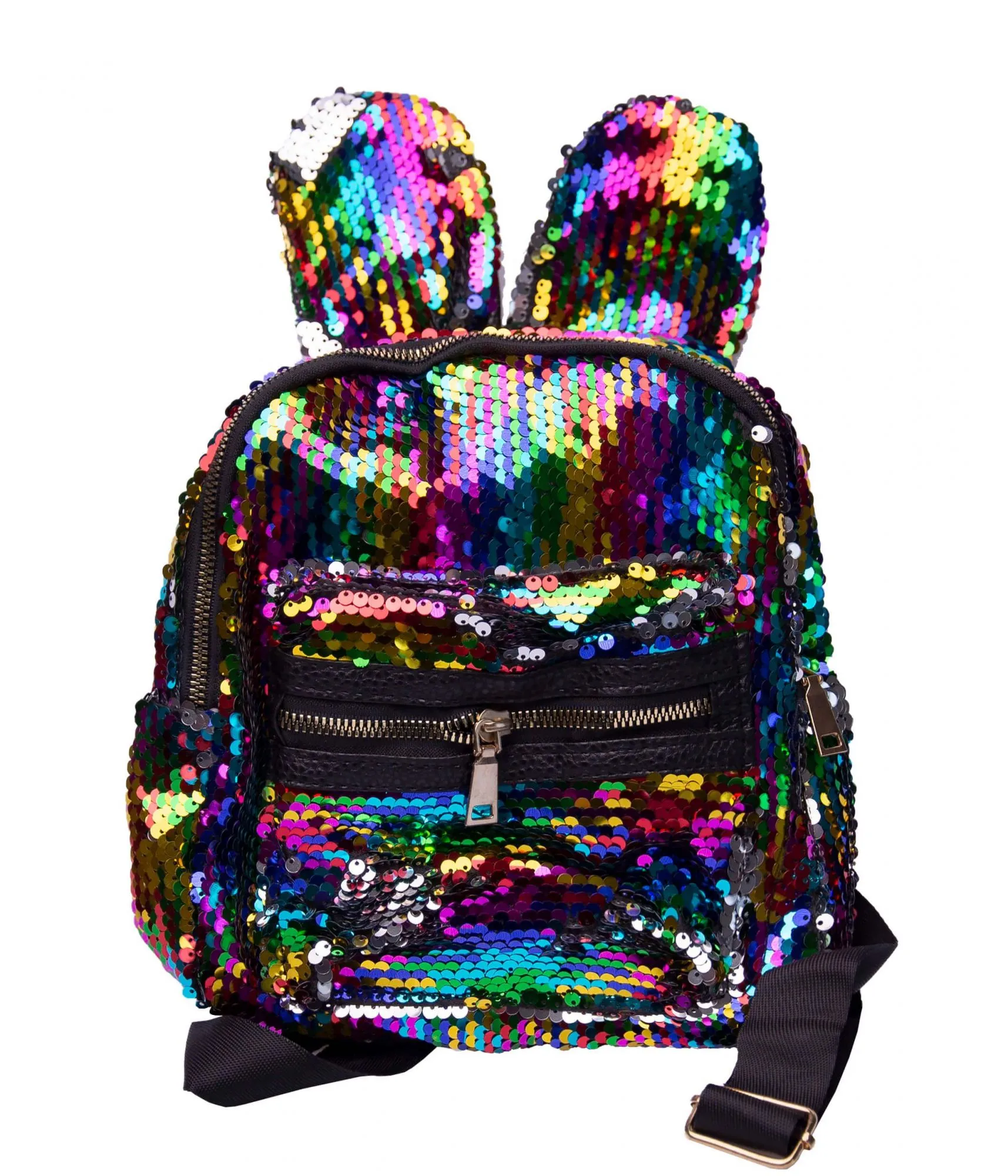 Очаровательный чёрно-радужный рюкзак с ушками, усыпанный переливающимися пайетками.